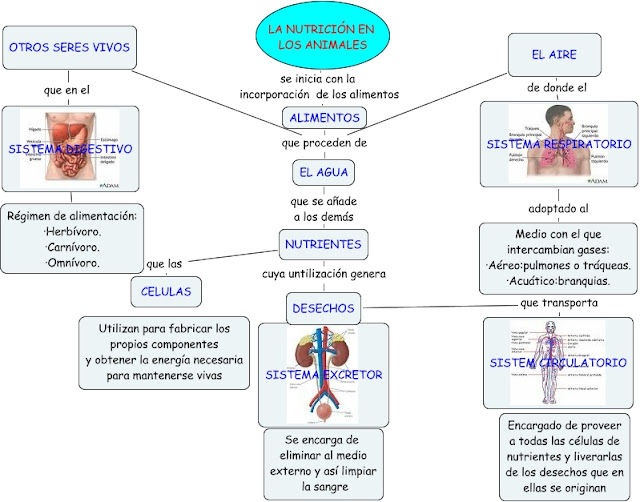 Al ser seres vivos heterótrofos, los animales no pueden fabricarse su alimento; por lo tanto necesitan ingerirlo introduciendo en su organismo seres vivos o restos de otros seres vivos; es decir, necesitan comer. Los alimentos que toman deben ser digeridos en el aparato digestivo, es decir, han de ser transformados para extraer de ellos los nutrientes que las células necesitan. Las sustancias nutritivas obtenidas de la digestión de los alimentos han de ser llevadas hasta las células. En los animales más complejos es la sangre del aparato circulatorio la que se encarga de esta misión. Según la clase de alimentos que coman, podemos clasificar a los animales en tres grandes grupos: